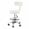 Стул круглый на хромированной стальной раме в форме пятилучия, оснащенный колесами и регулировкой высоты, при помощи газ-лифта.